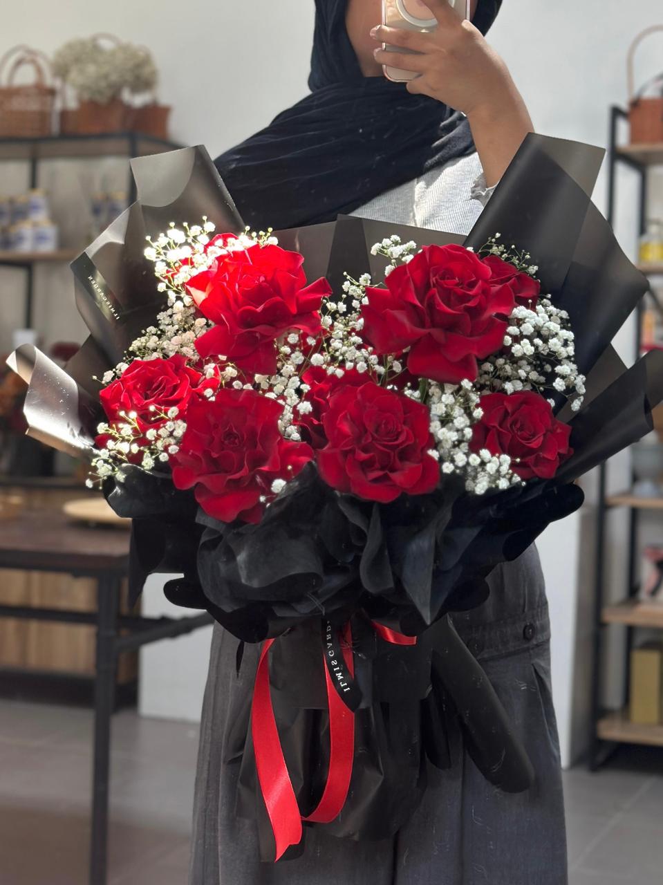 Red Noir Bouquet adalah rangkaian mawar merah tua nan memukau yang memancarkan pesona misterius dan elegan. Warna merah pekatnya melambangkan gairah, kekuatan, dan cinta yang mendalam, sempurna untuk mengungkapkan perasaan intens dengan sentuhan kemewahan dan keanggunan klasik.