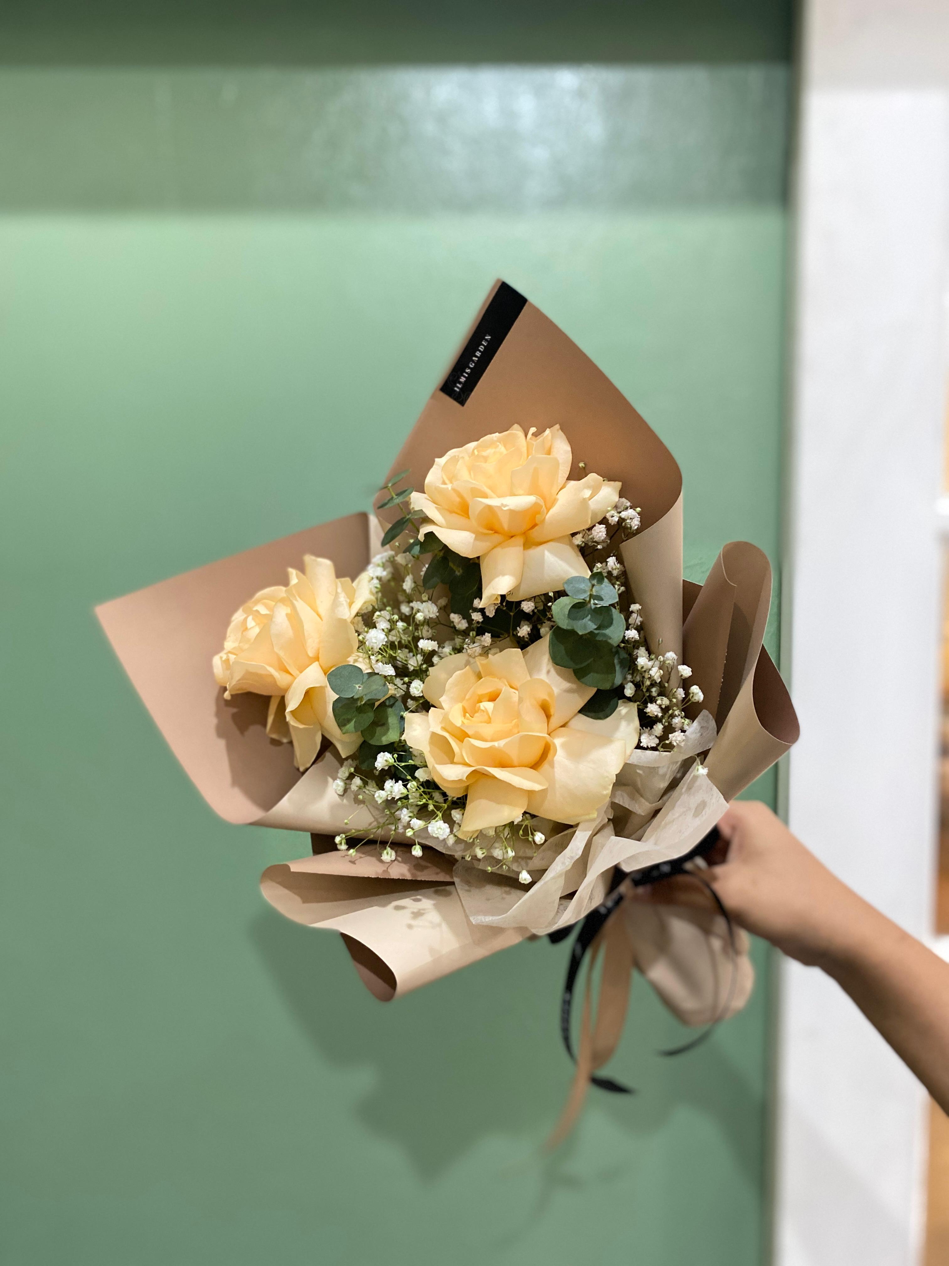 Bouquet ini terdiri dari 3 tangkai mawar, dan filler.