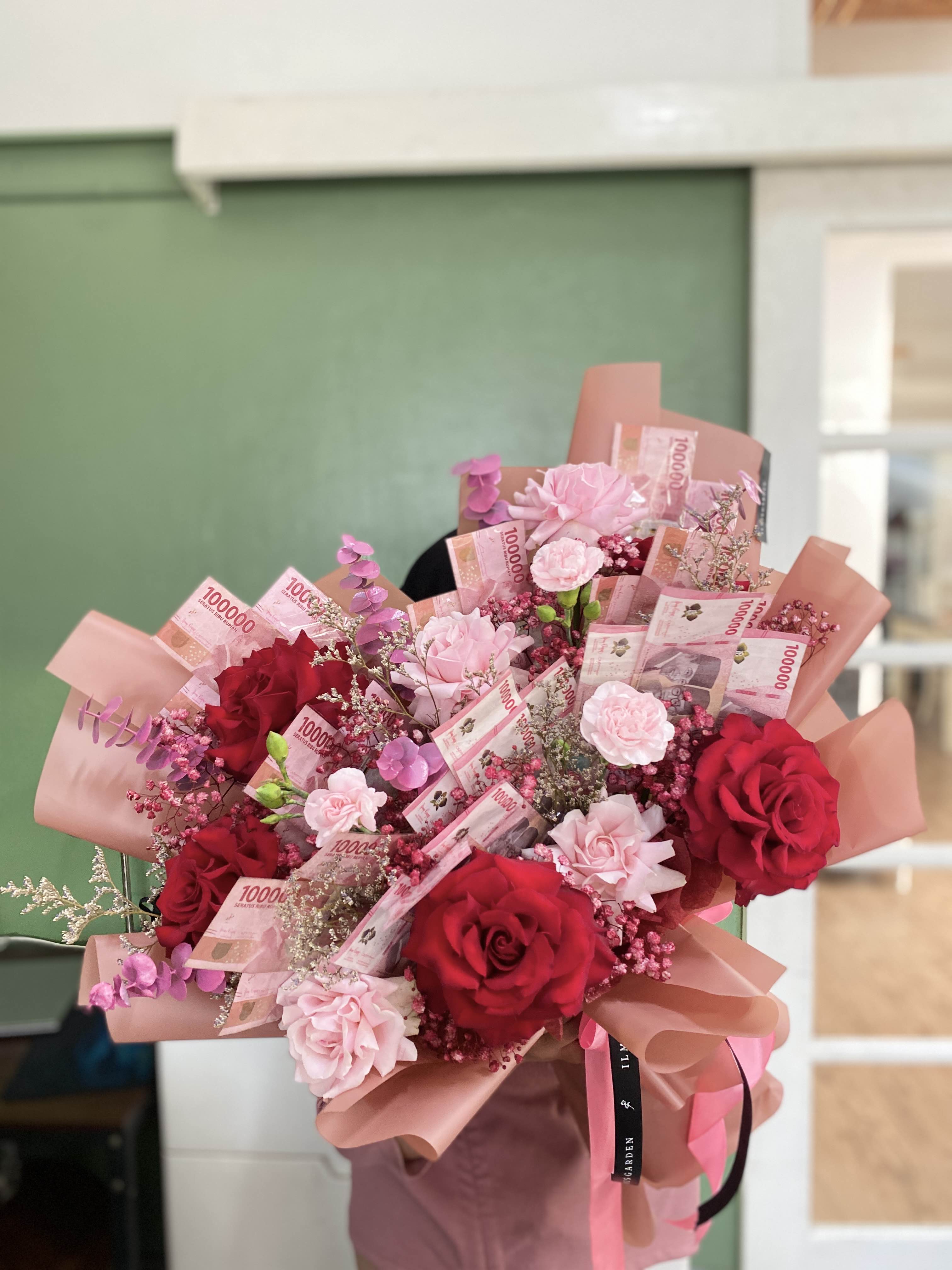 Dusty Money Bouquet adalah buket eksklusif yang memadukan lembaran uang tersusun rapi dengan bunga segar, menghadirkan kesan mewah, elegan dan penuh makna.
