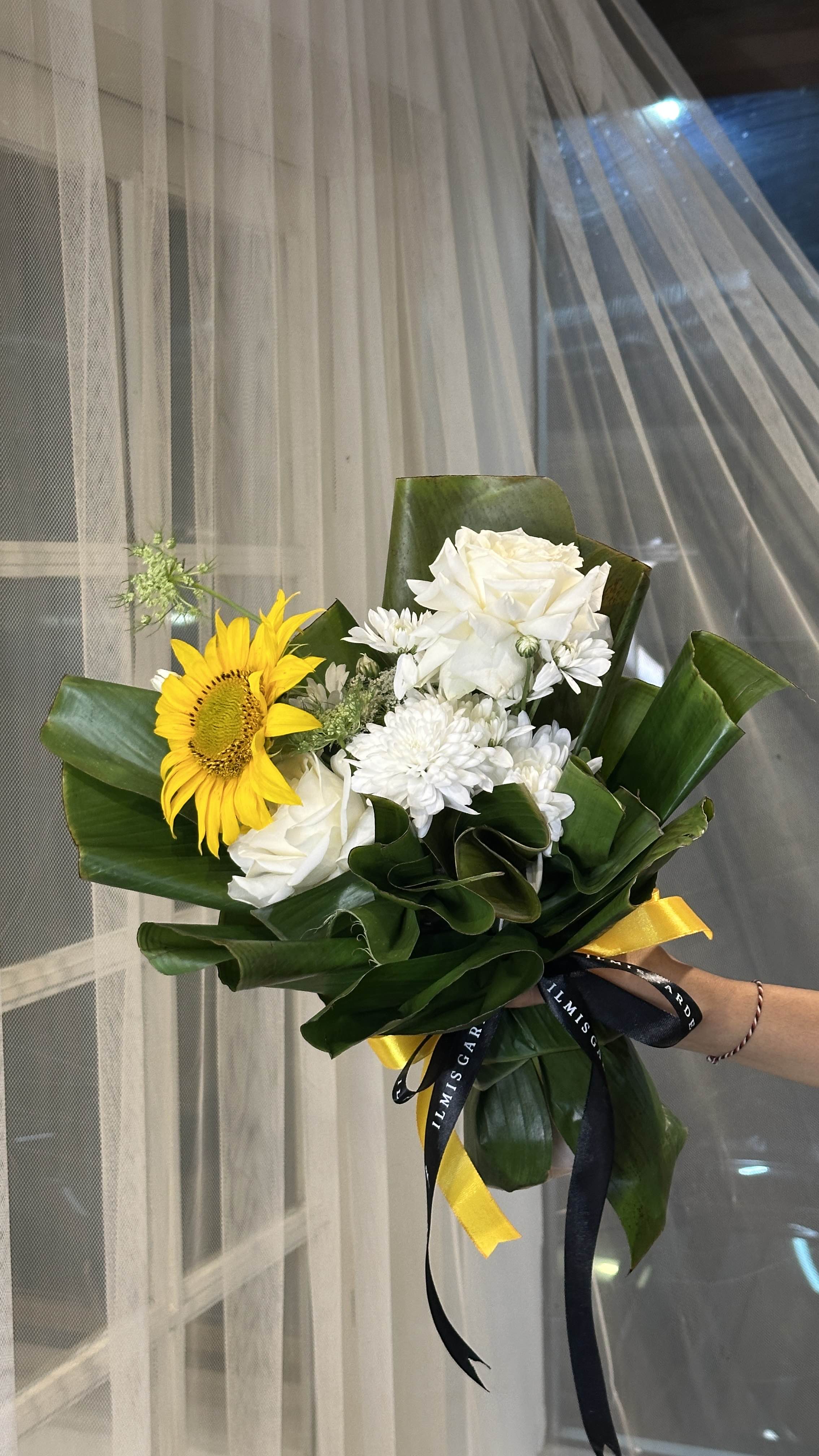 Rangkaian bunga ramah lingkungan dengan wrapping daun pisang yang alami dan elegan. Menghadirkan kesan earthy, unik, dan berkelanjutan tanpa plastik. Kombinasi bunga segar dipadukan dengan tekstur daun yang eksotis, menciptakan tampilan modern namun natural.