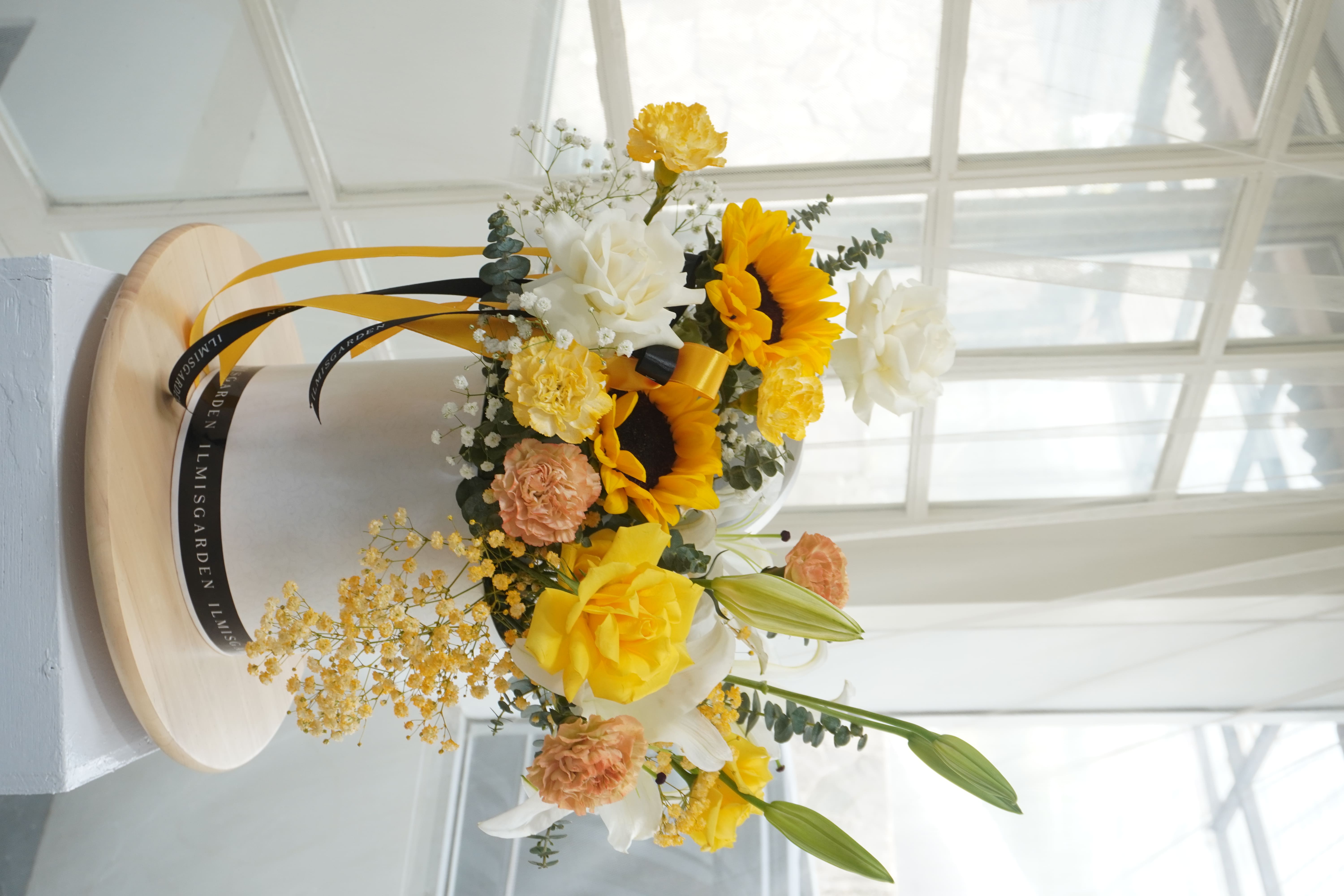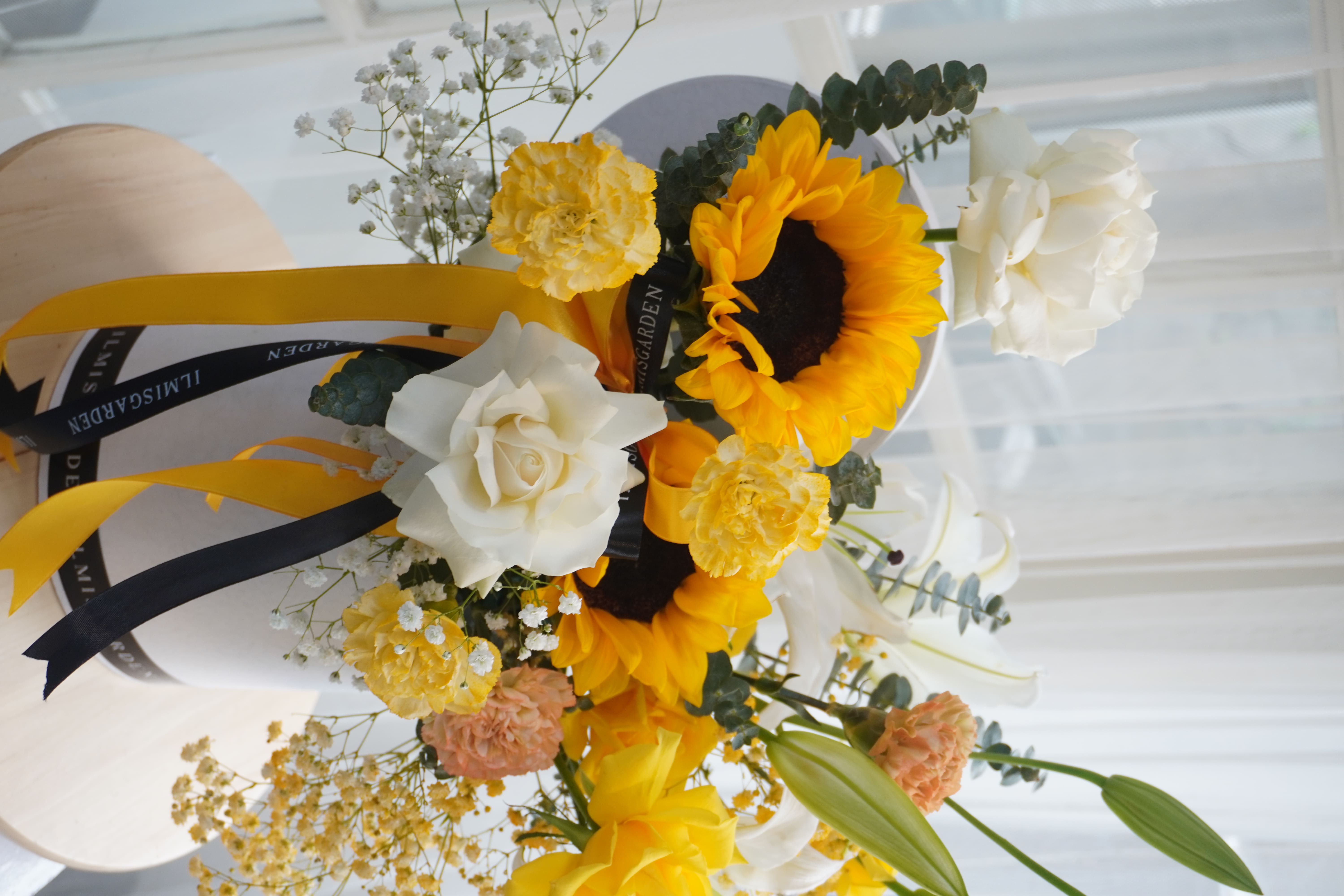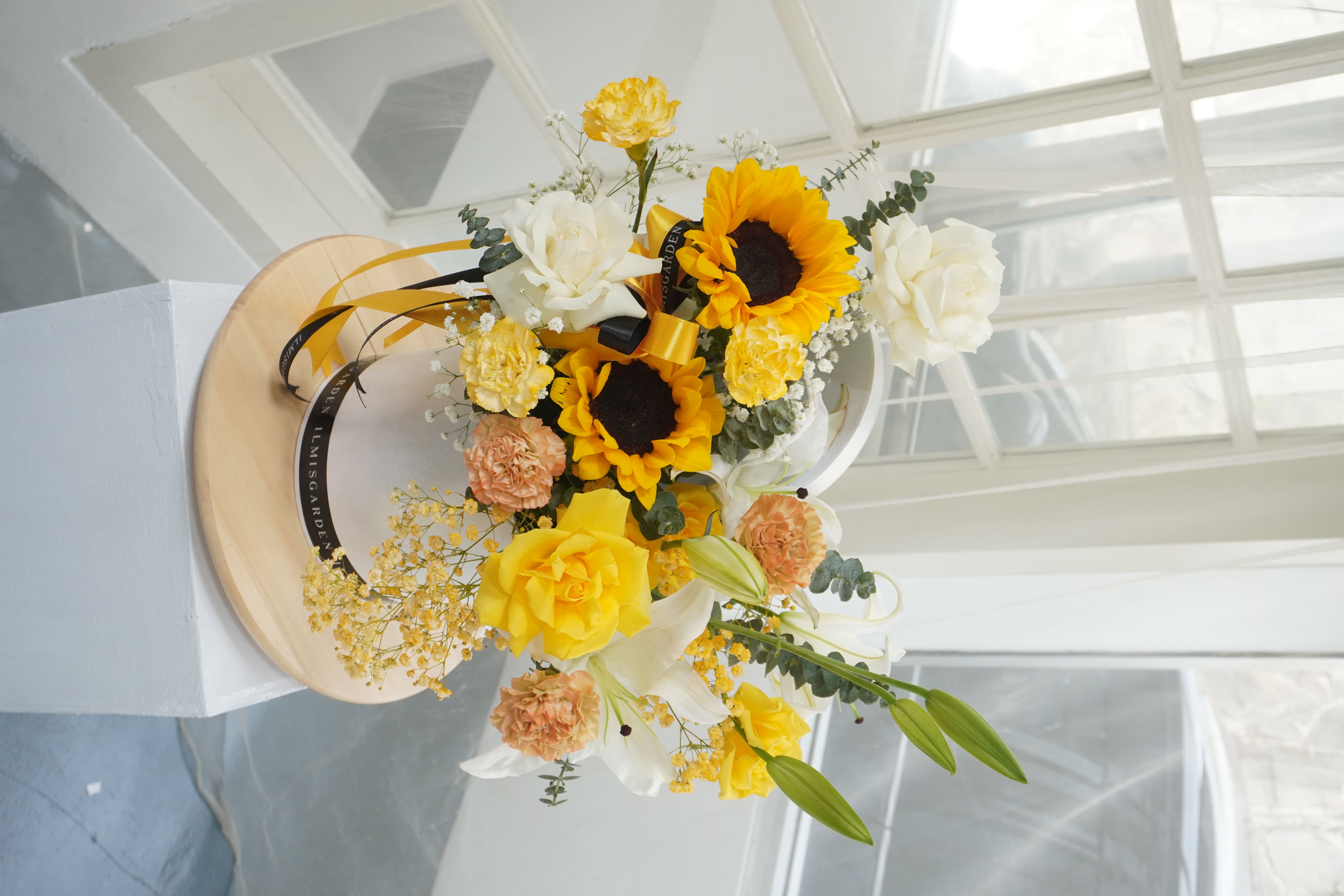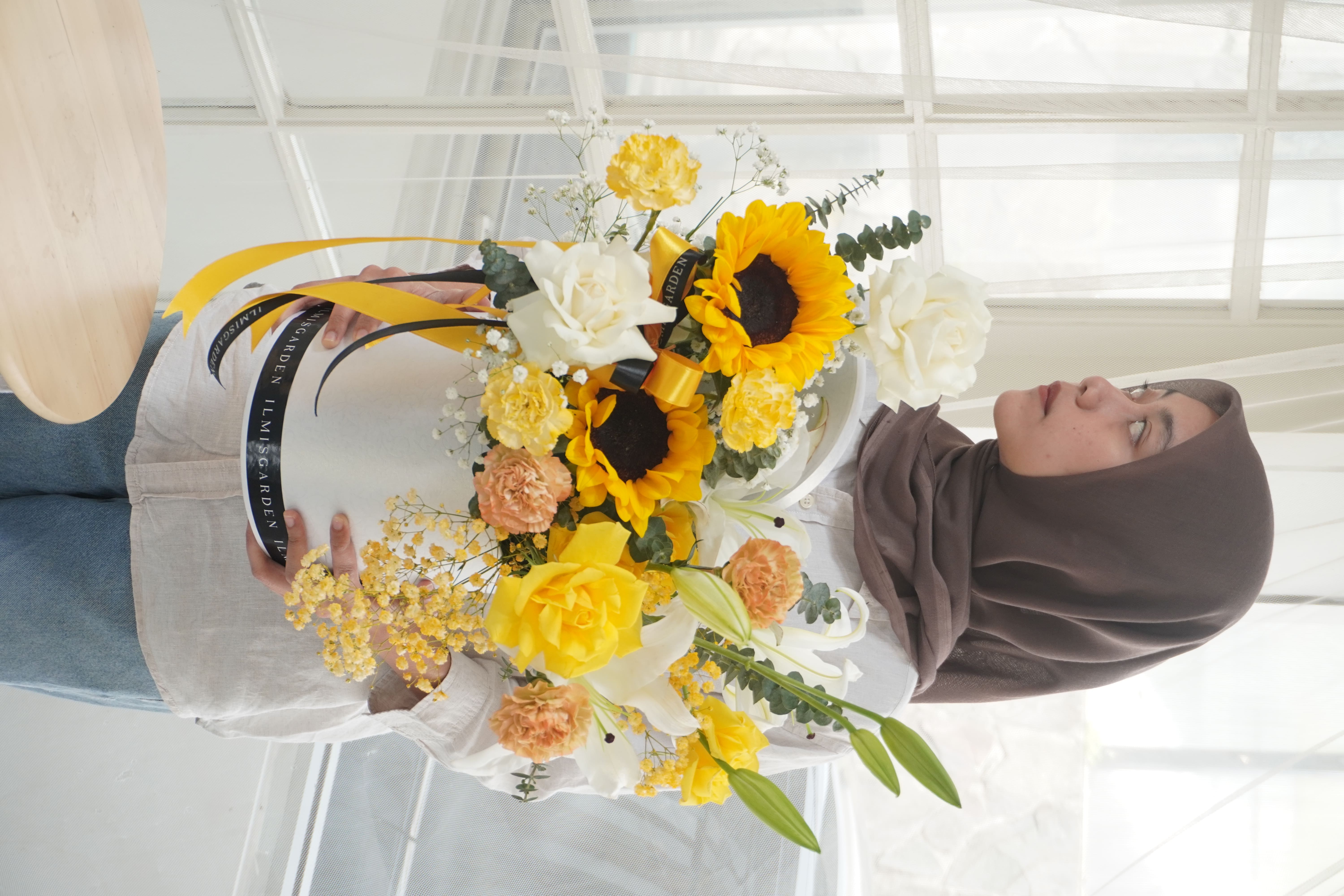 Rangkaian bunga cerah penuh kehangatan ini memadukan keindahan sunflower, lily putih, mawar putih & kuning, serta dianthus peach & kuning dalam sebuah box premium bernuansa elegan. Kombinasi warna kuning, putih, dan peach melambangkan kebahagiaan, kemurnian hati, dan apresiasi yang tulus, menjadikannya pilihan sempurna untuk mengirimkan energi positif dan doa terbaik.
