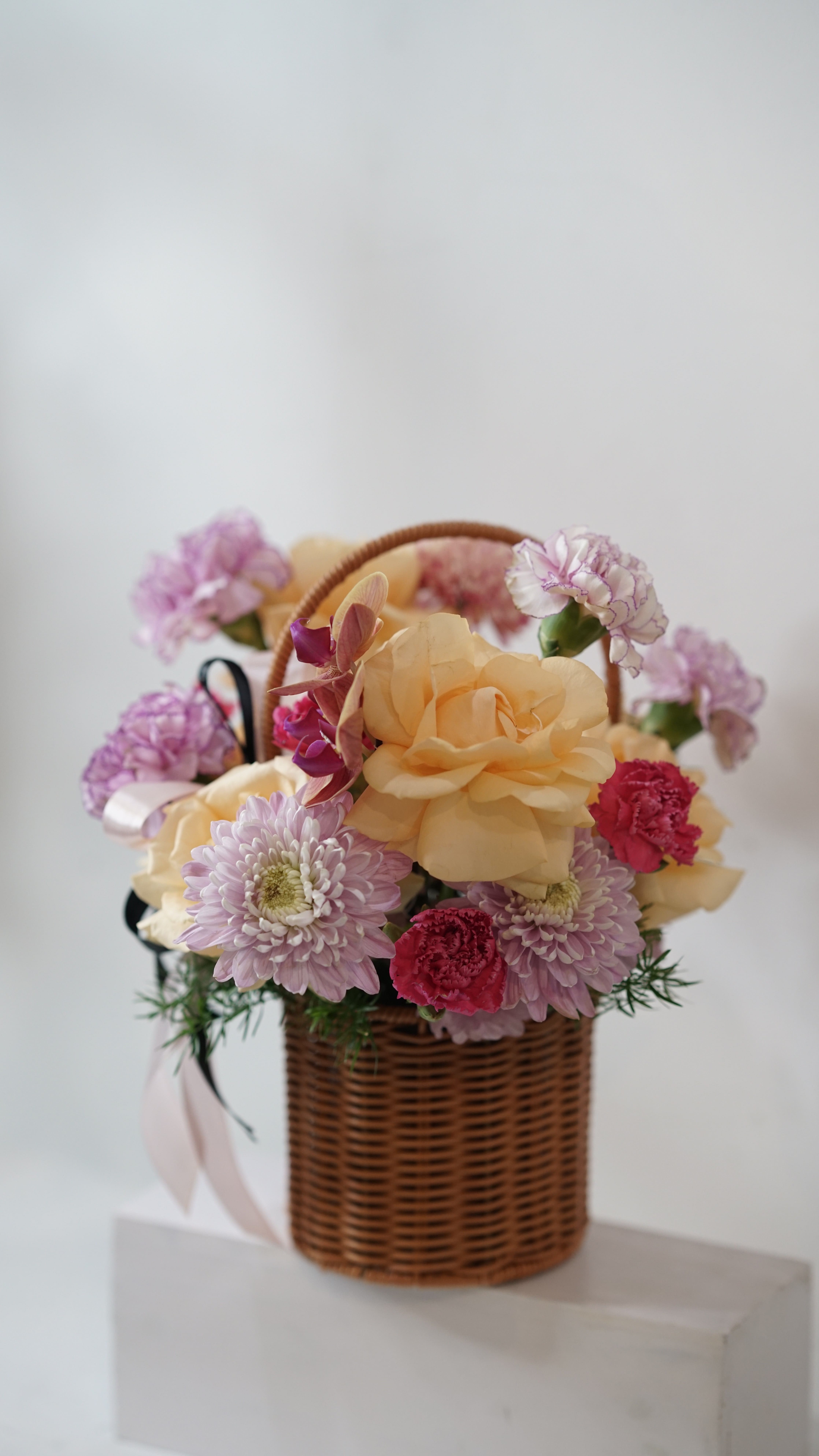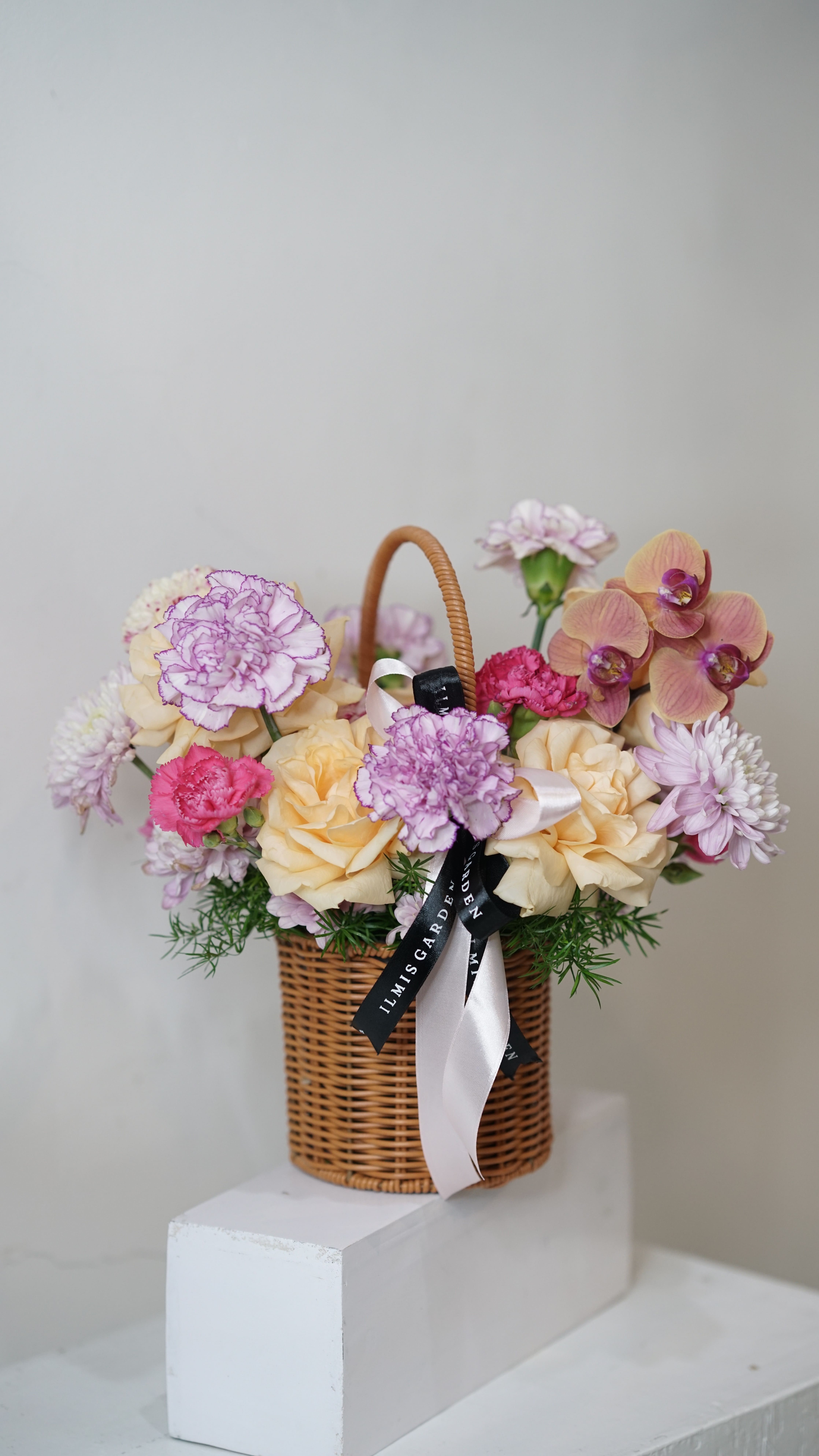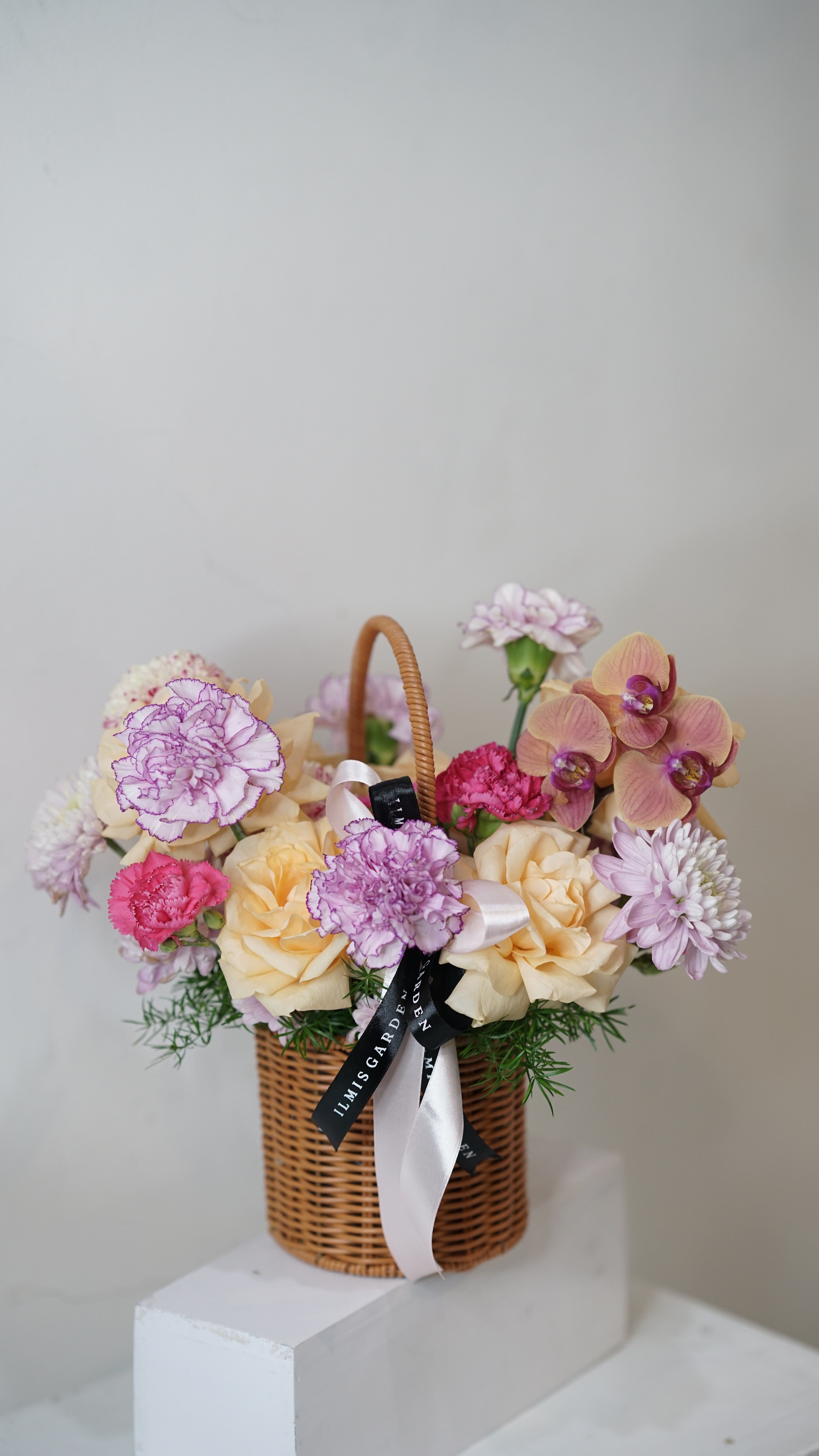 Rangkaian bunga dalam keranjang ini memadukan mawar peach, dianthus ungu dan carnation pink, krisan, serta anggrek phalaenopsis bernuansa peach. Disusun 360 derajat dengan gaya garden yang natural, rangkaian ini menghadirkan kesan manis, elegan, dan penuh kehangatan. Perpaduan warna pastel yang lembut menciptakan suasana ceria namun tetap anggun, cocok untuk ungkapan kasih sayang, ucapan terima kasih, ulang tahun, maupun hadiah istimewa untuk orang terdekat.