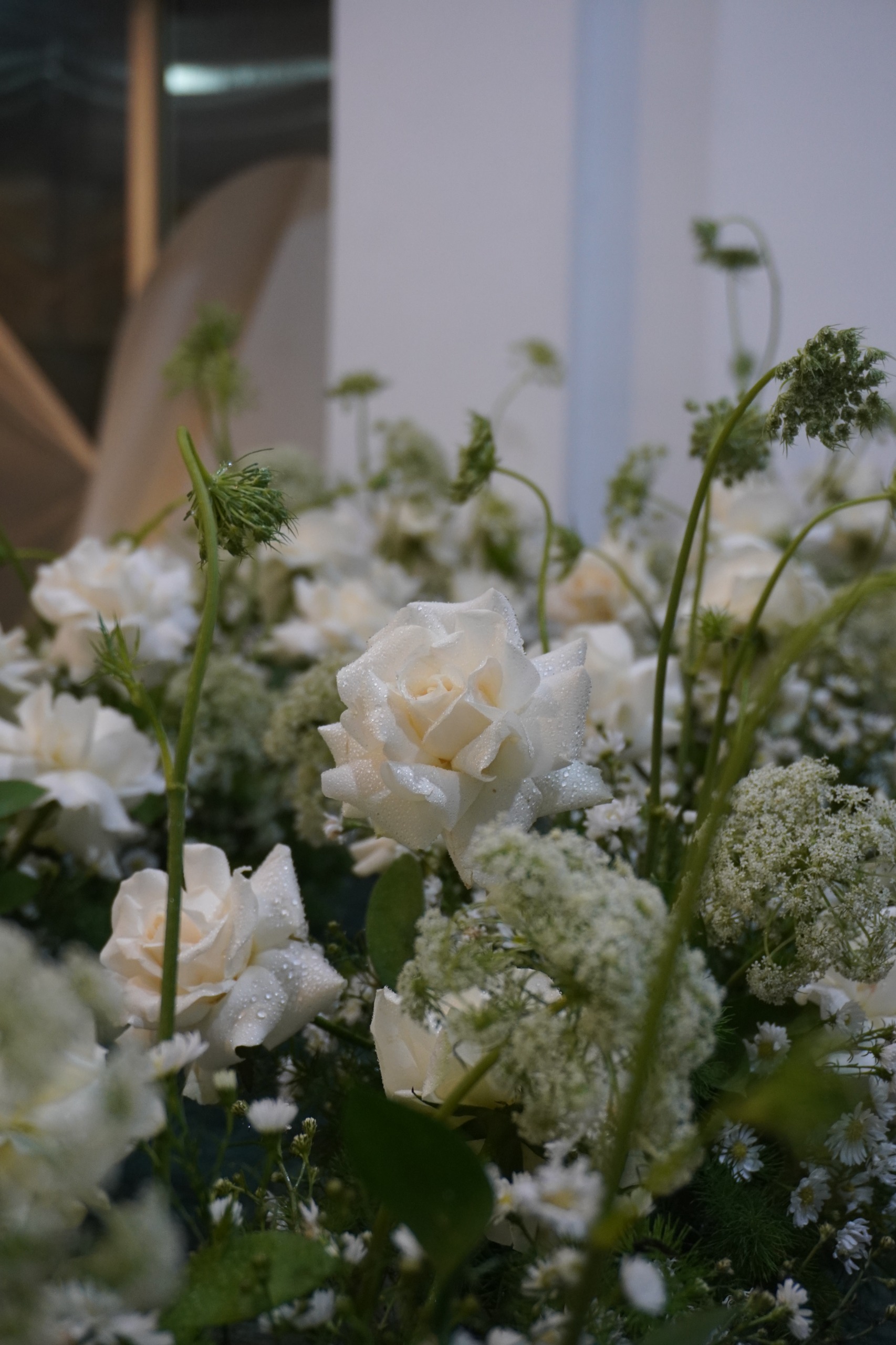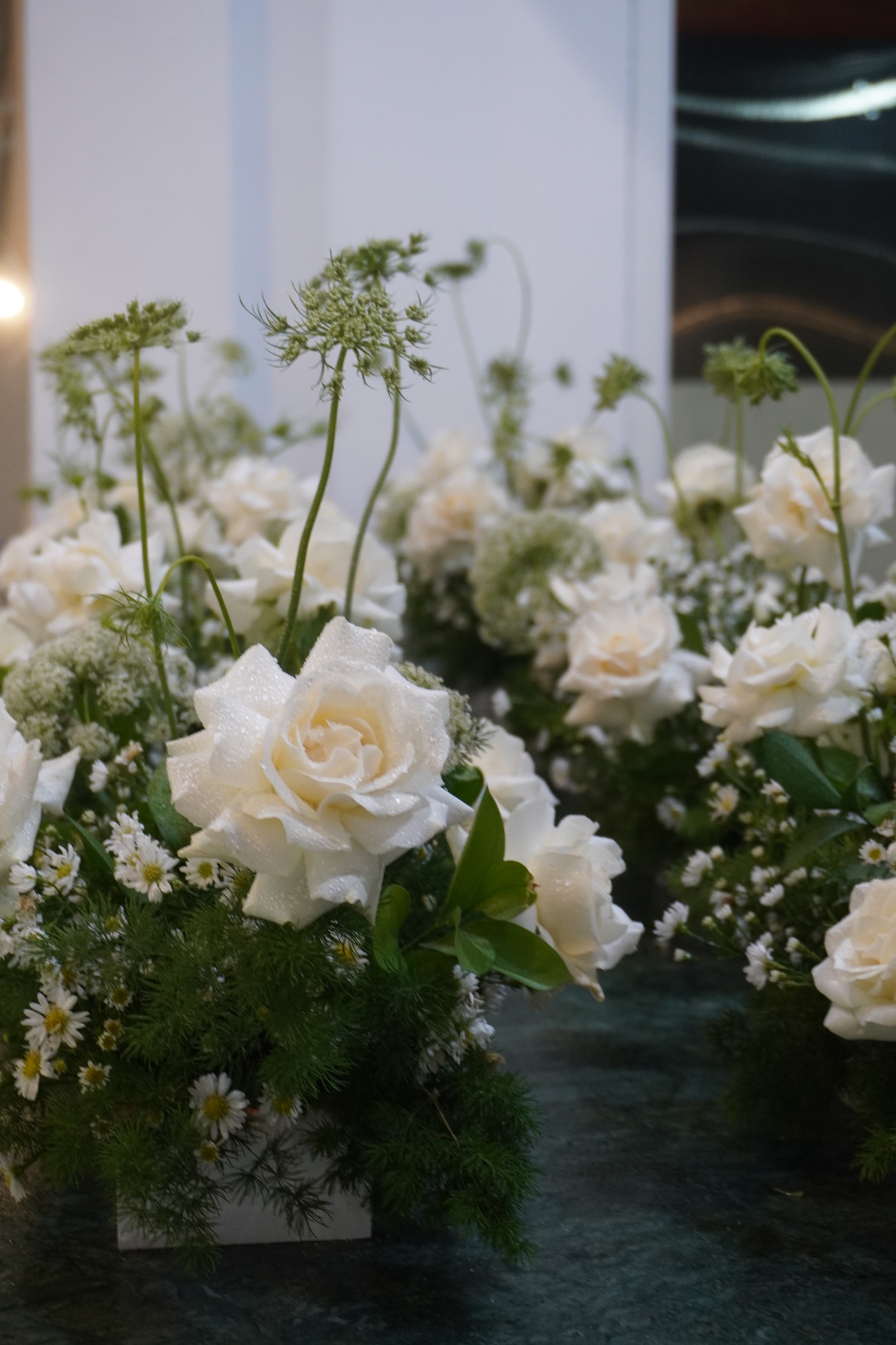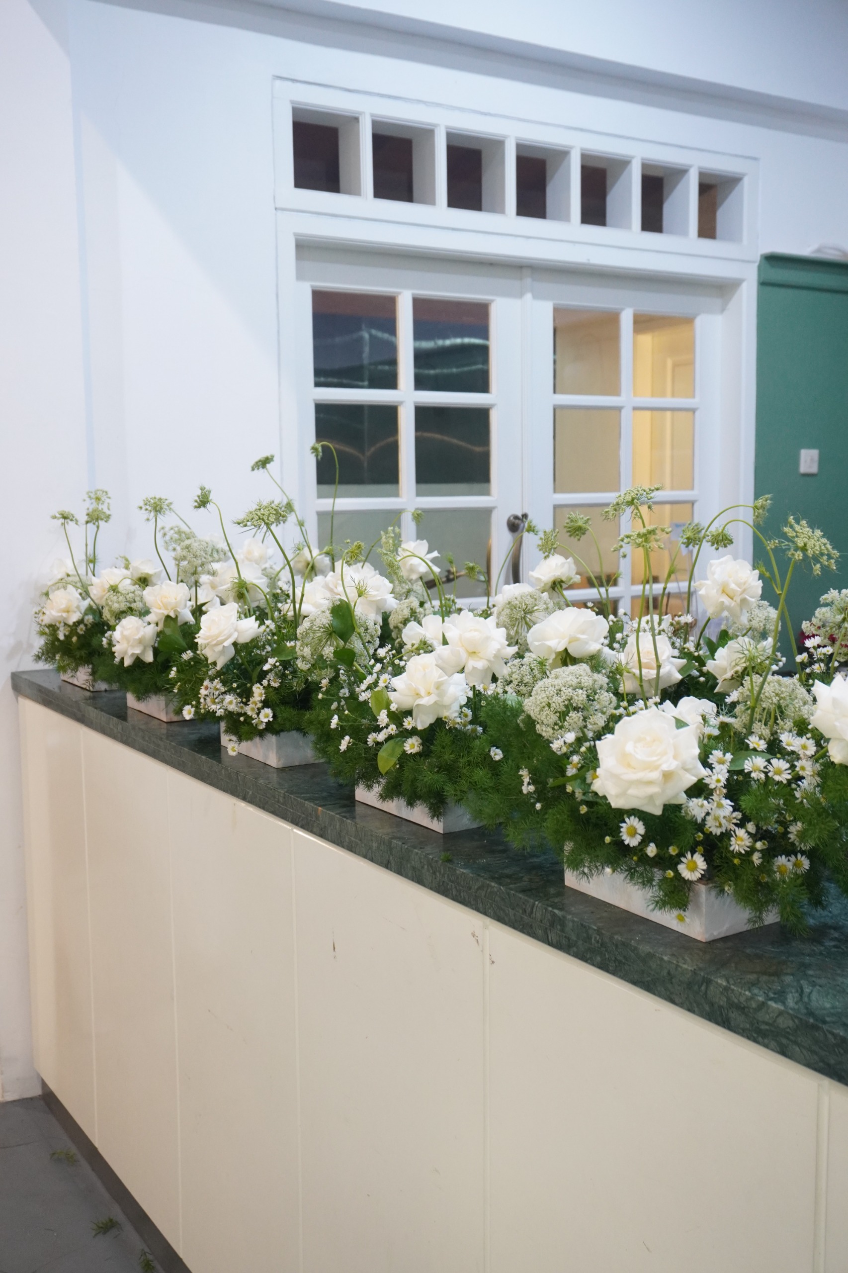Rangkaian centerpiece ini menghadirkan keindahan putih alami yang lembut dan menenangkan. Disusun dengan bunga mawar putih yang anggun, dipadukan dengan baby breath/bunga peacock, bunga ammimajus hijau muda, serta dedaunan segar yang memberi kesan natural dan seimbang. Diletakkan dalam box putih minimalis, rangkaian ini cocok sebagai dekorasi meja, hadiah ucapan terima kasih, hingga pelengkap acara intimate dengan konsep clean dan elegan. Memberikan sentuhan ketenangan, kesederhanaan, dan keanggunan dalam satu rangkaian yang timeless.