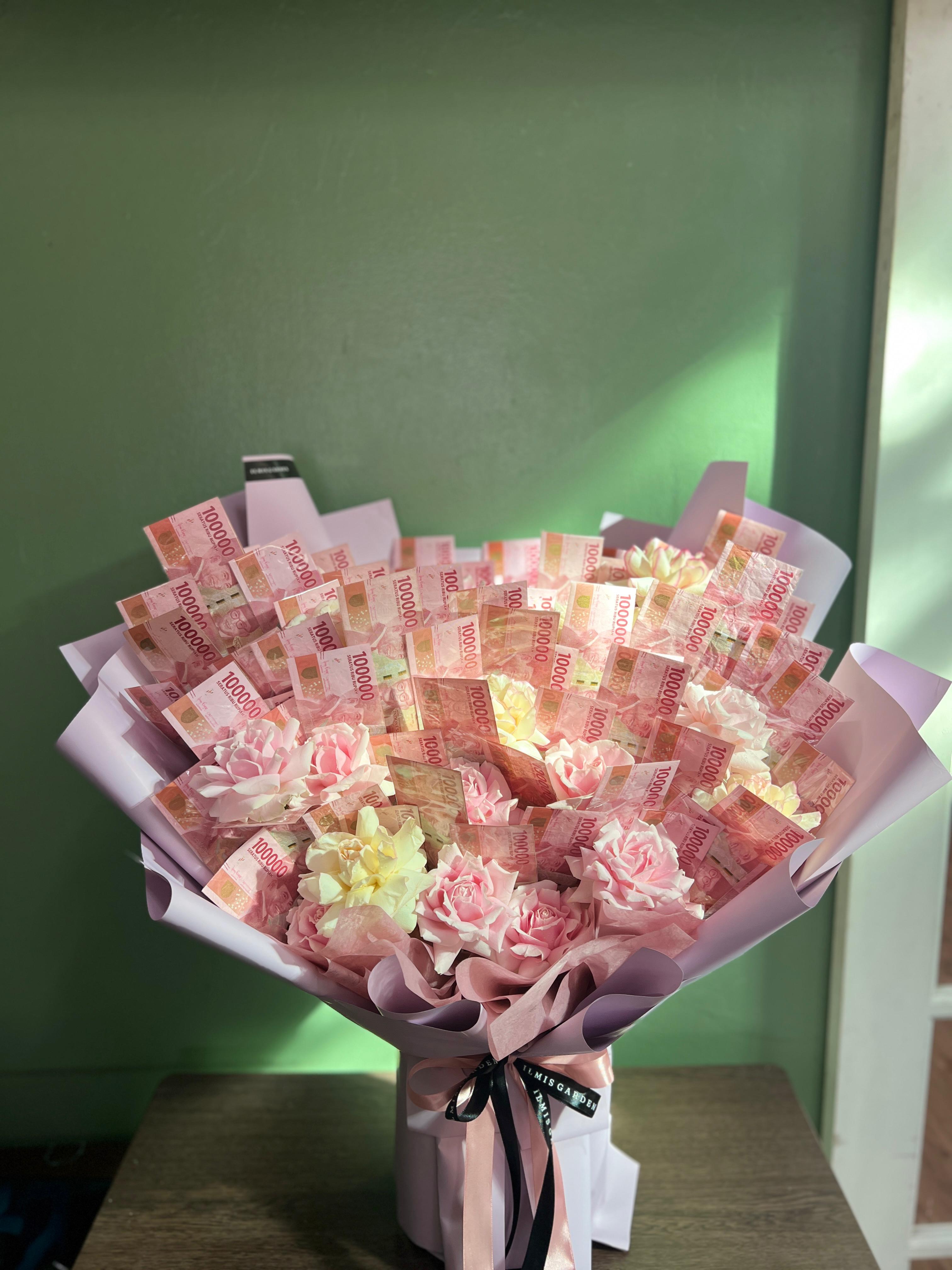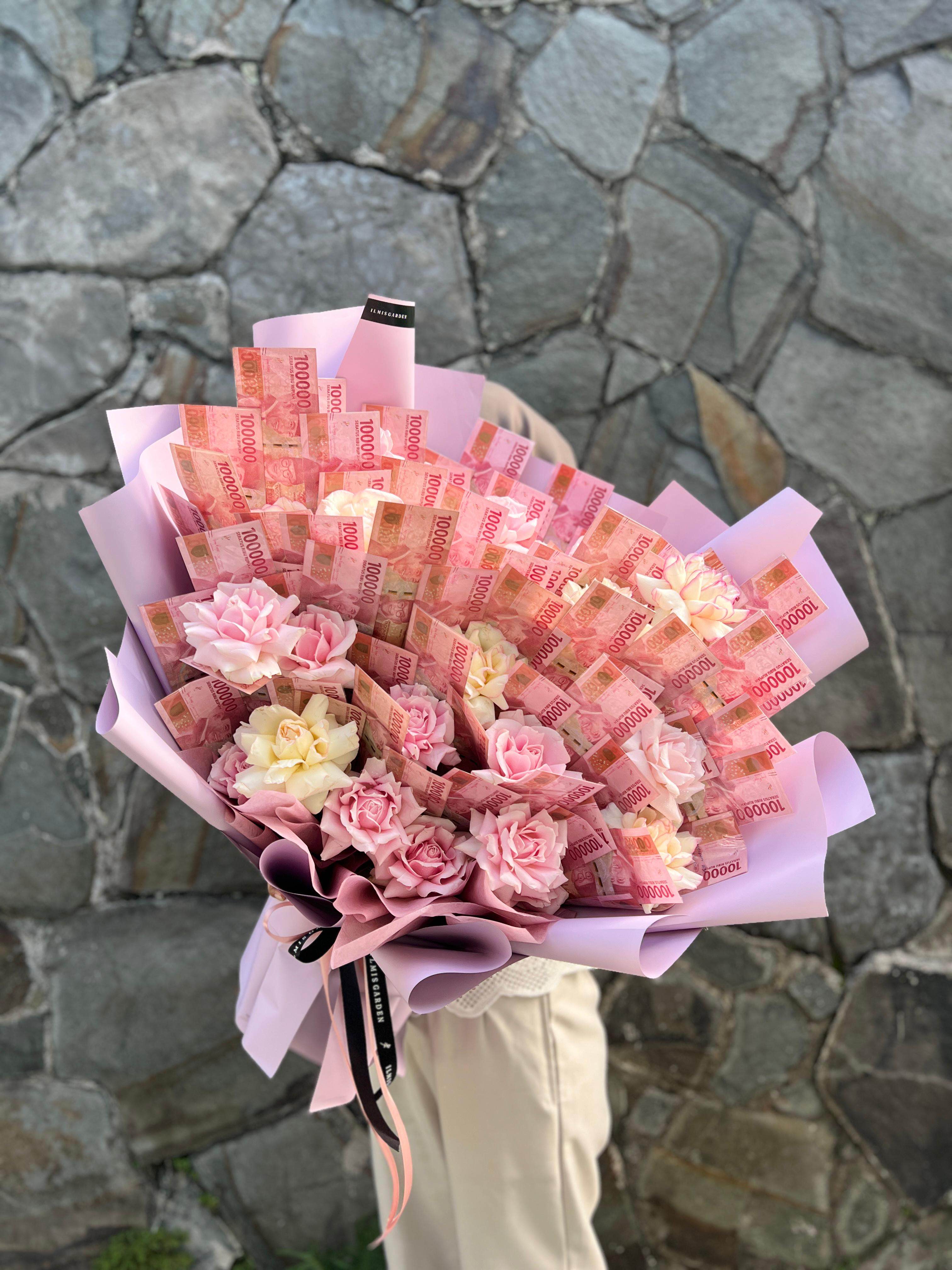 Deluxe Money Bouquet ini menampilkan uang 100 lembar yang disusun rapi dipadukan dengan mawar pink dan mawar putih. Dominasi warna pastel memberikan kesan tenang, dan modern. Rangkaian ini tidak hanya menarik secara visual, tetapi juga melambangkan doa kemakmuran, harapan baik, dan keberuntungan. Cocok dijadikan hadiah wisuda, ulang tahun, atau perayaan pencapaian spesial dengan sentuhan yang berbeda dan berkesan.