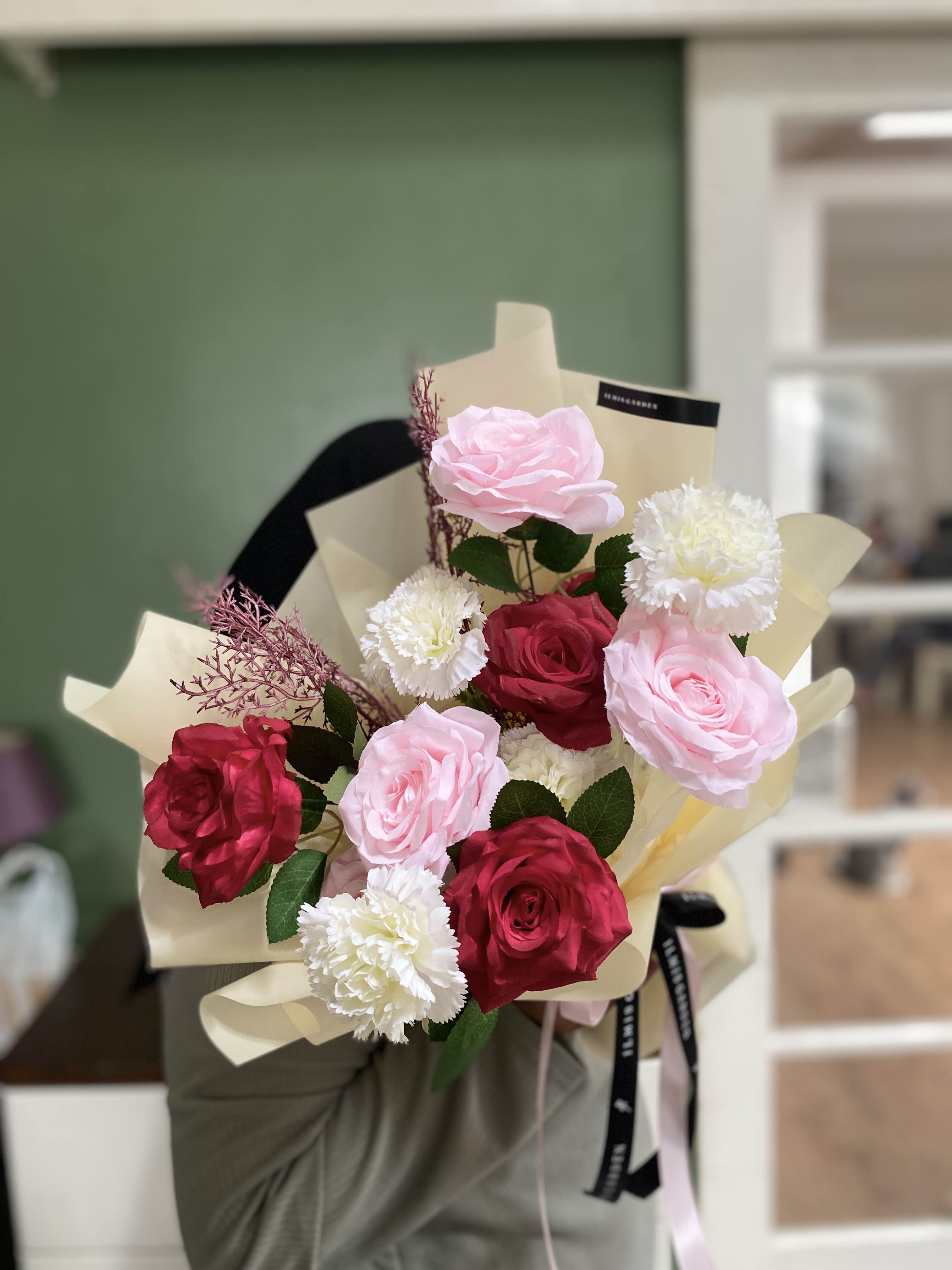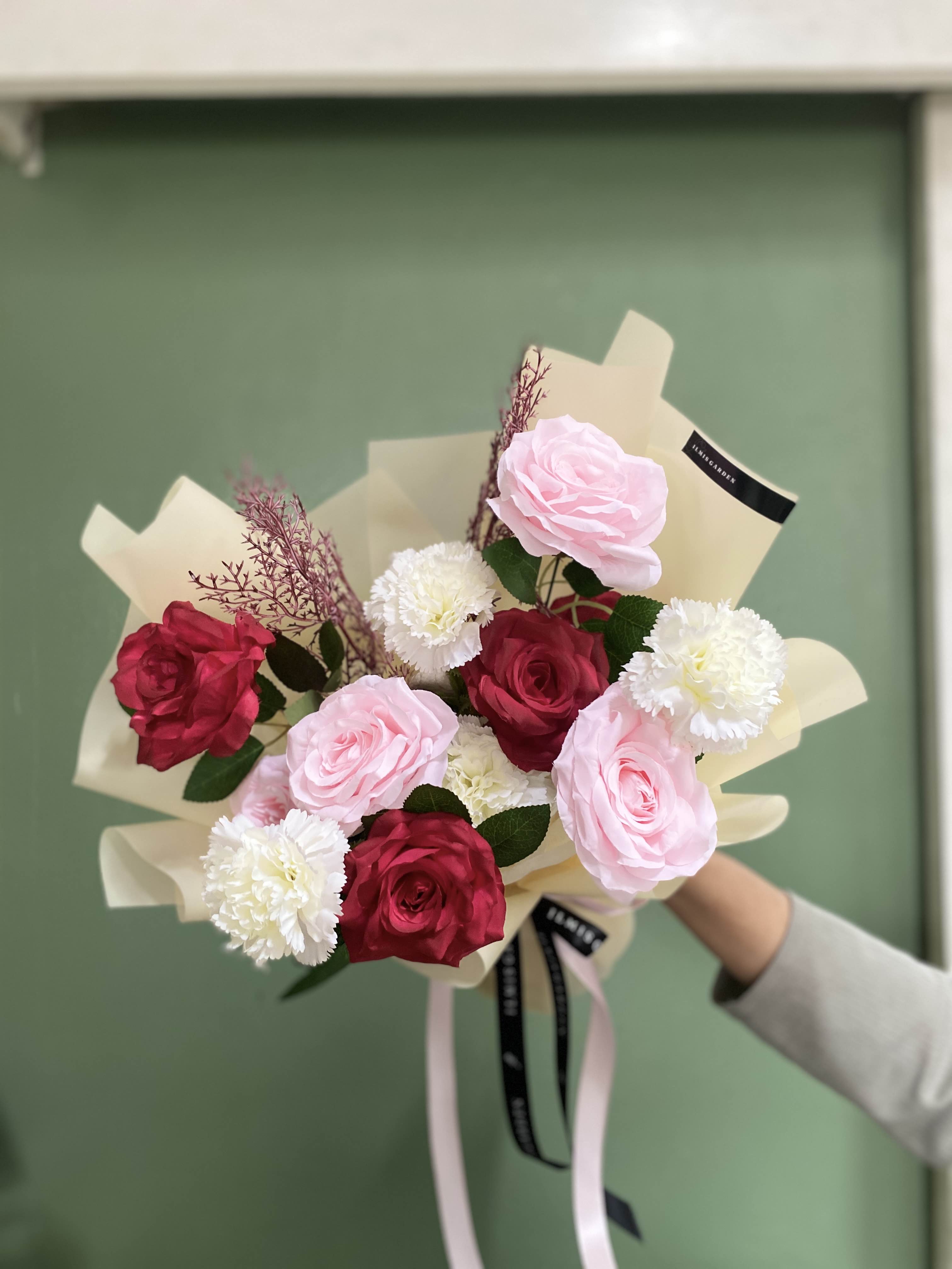 Heartfelt Artificial Bouquet ini menampilkan perpaduan bunga mawar pink, mawar merah, dan carnation putih sebagai fokus utama. Rangkaian ini melambangkan cinta yang tulus dan penuh kasih, disertai rasa hormat, perhatian, dan kehangatan yang lembut. Cocok untuk menyampaikan perasaan yang dalam namun tidak berlebihan seperti valentine, anniversary, atau wisuda. Bouquet artificial ini akan tetap cantik dan tahan lama meski tanpa perawatan.